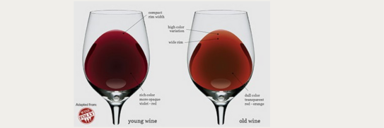 With red wine a youthful example will have deep ruby and purple colours. With age the intensity reduces, and browner (eventually tawny) colours develop. Again, please look at the very good Wine Folly ® picture which illustrates this.