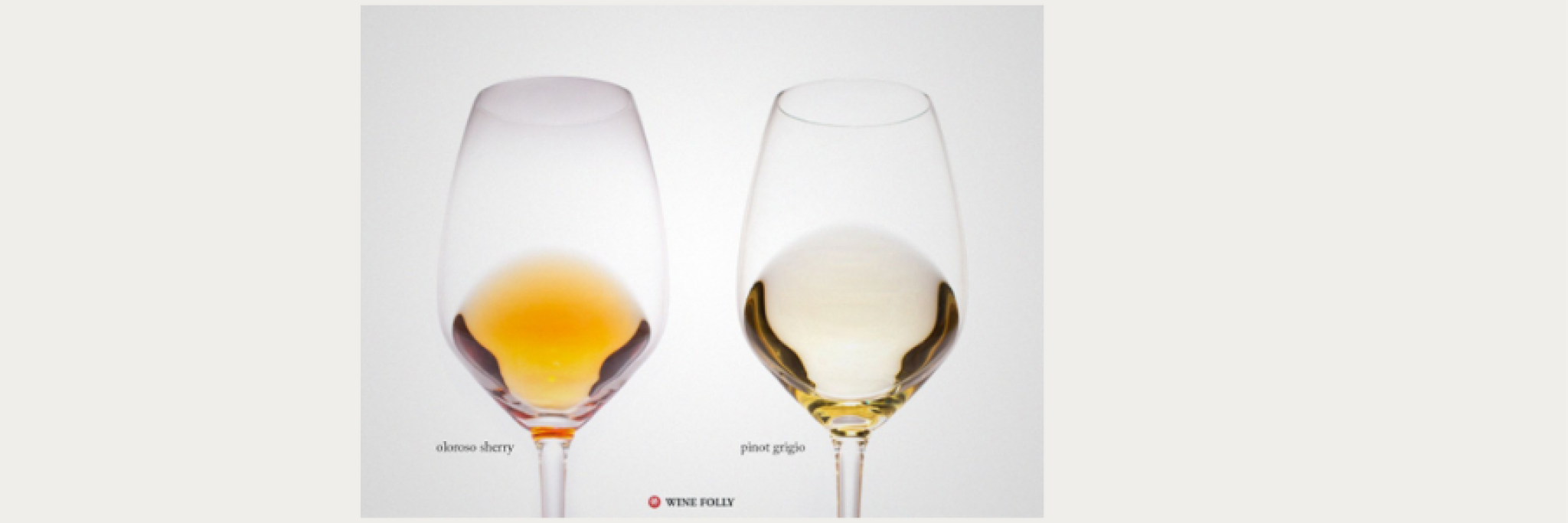 As wine ages its colour changes significantly. For both whites and reds, the wine becomes browner over time. If the wine has been aged in an oxidative environment this will be exaggerated (please see the Wine Folly ® picture of a young Pinot Grigio (made in a completely non oxidative process) versus and a cask aged Oloroso sherry of around 12 years of age).